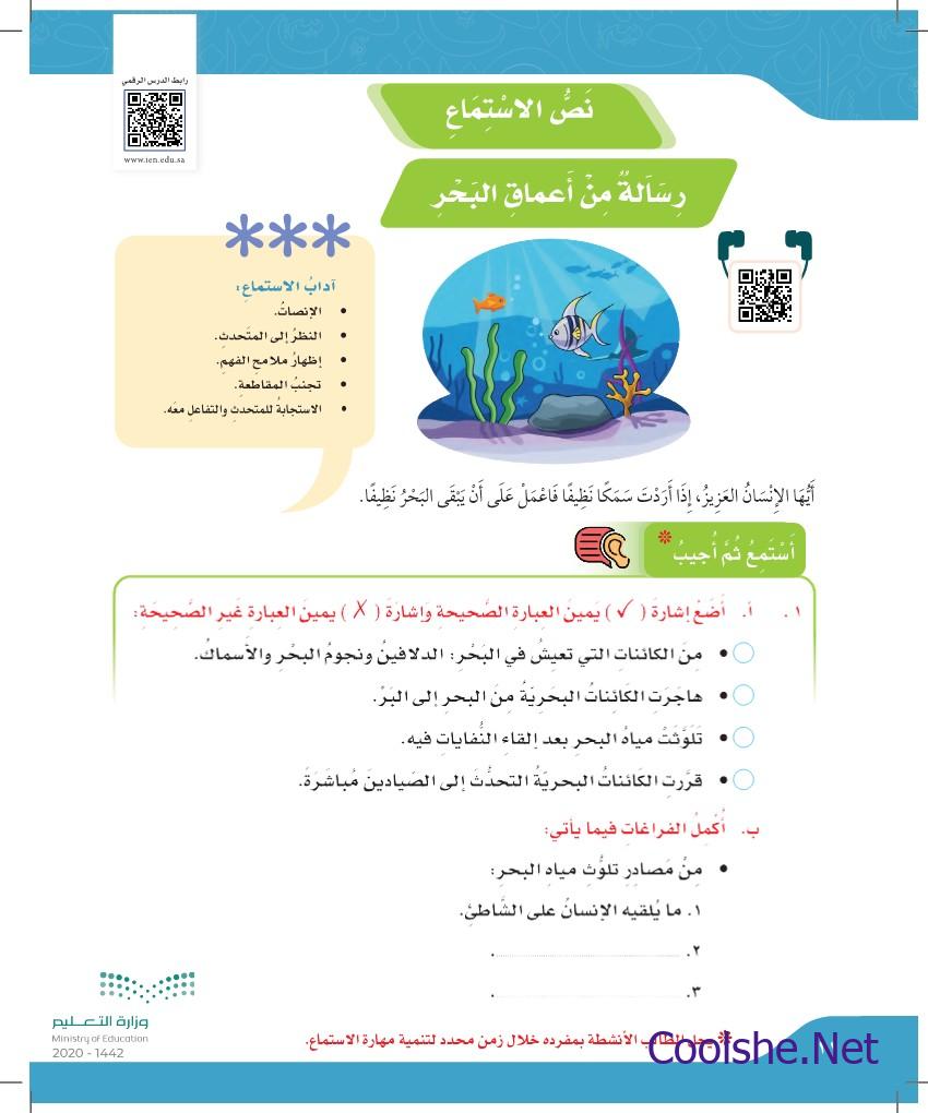 فسر سبب موت الأسماك كما ورد في النص نقدم لكل طلابنا الأعزاء الإجابة الصحيحة عن سؤال فسر سبب موت الأسماك كما ورد في النص.، وهو سؤال ضمن نص رسالة من أعماق البحر ضمن مادة لغتي الجميلة الصف الخامس الابتدائي الفصل الدراسي الأول .