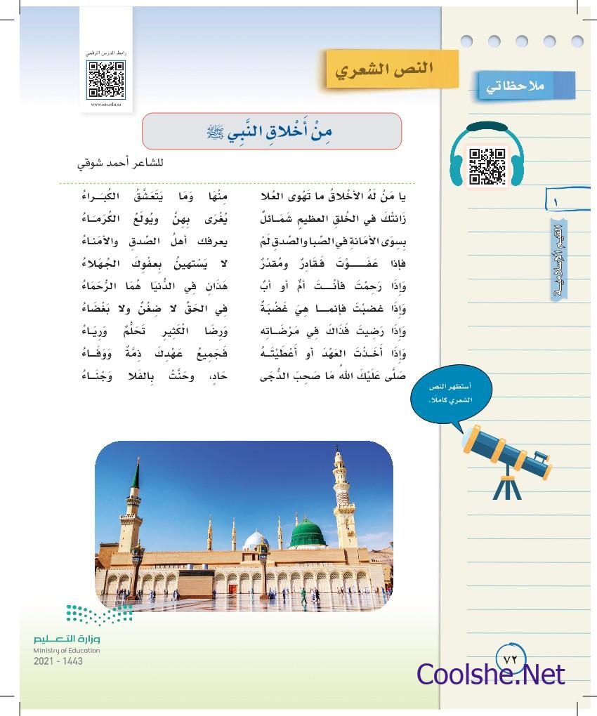 تدور أبيات النص الشعري من أخلاق النبي حول، سؤال مهم يكثر البحث عن إجابته من قبل طلاب الصف الأول المتوسط ضمن مادة اللغة العربية العربية ، ودرس النص الشعري من أخلاق النبي صلى الله عليه وسلم
